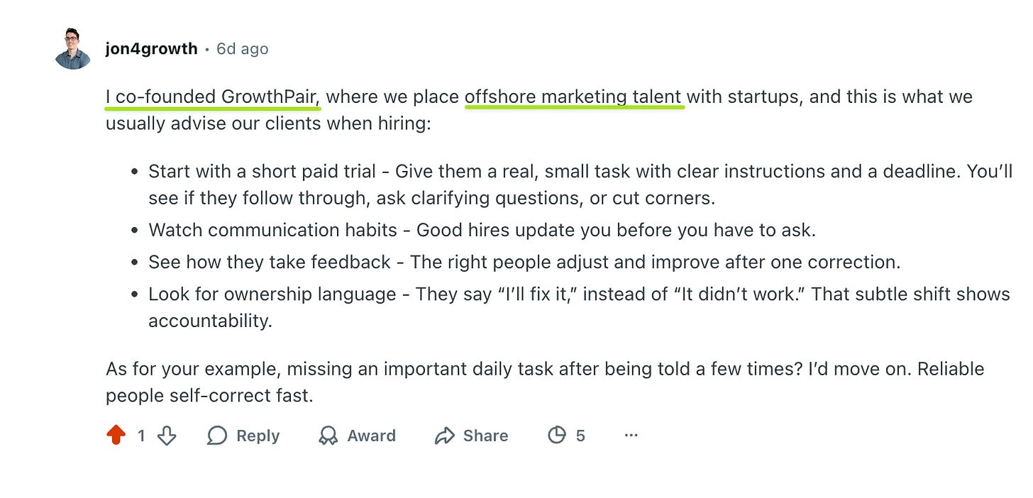 For GrowthPair, I track topics around startups hiring which is our core niche. But you can cast a wider net if it’s still relevant. For example, if you sell fishing gear, outdoor or lifestyle communities still count. The goal is to participate where your audience already is, not force-fit your content.