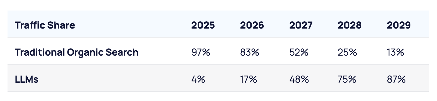 If you’re still skeptical about AEO’s potential, SEMRush published data projecting that LLM-driven discovery will surpass traditional organic search by 2028. The shift is coming fast.